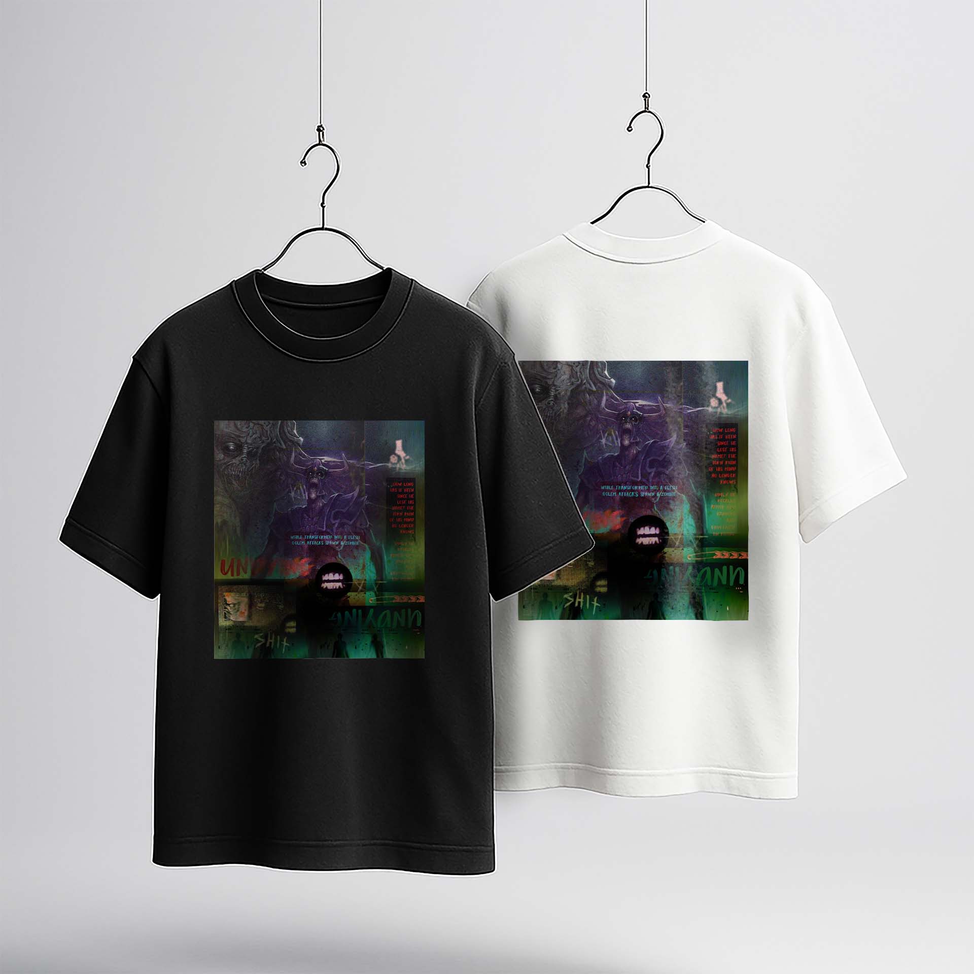 طرح پوستر مانندی با رنگهای سبز و بنفش تیره، نویزهای درهم و متنهایی که نصفه خونده میشن، فضای یه دنیای پوسیده رو زنده میکنه..