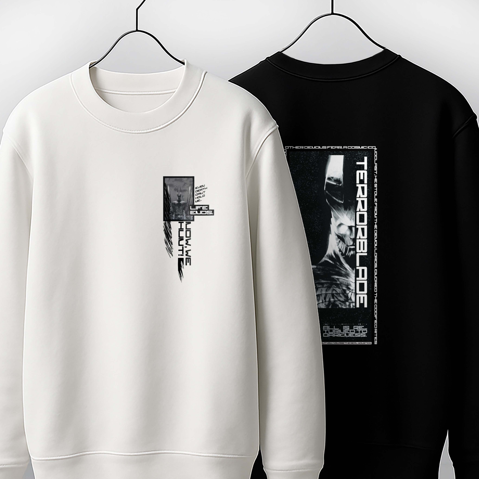 و اما پشت کار یک کادر عمودی که تصویری بزرگ تری از تروربلید رو با همون افکت ها و سایههای خاص، تایپو گرافی های دور کادر و فضای دارک می بینیم...