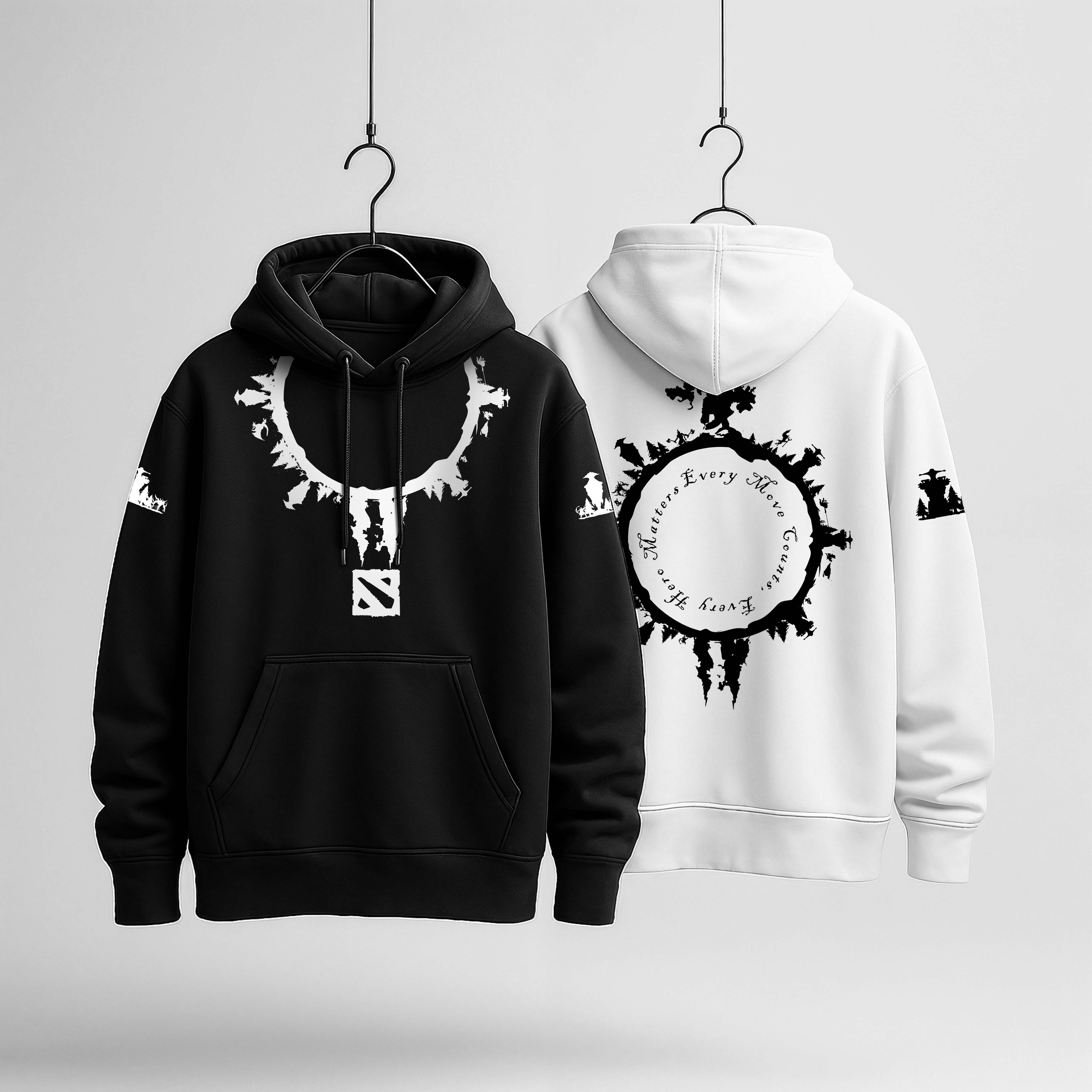 جلوی کار، یک نیم‌دایره مثل یک گردنبند قدرت روی سینه نشسته؛ ترکیبی از شکل ایشنت ها، تاورها، مسیرها و سایه‌ی هیروها و لوگو بازی که هرکسی دوتا2 پلیر باشه همون لحظه می‌شناسه!