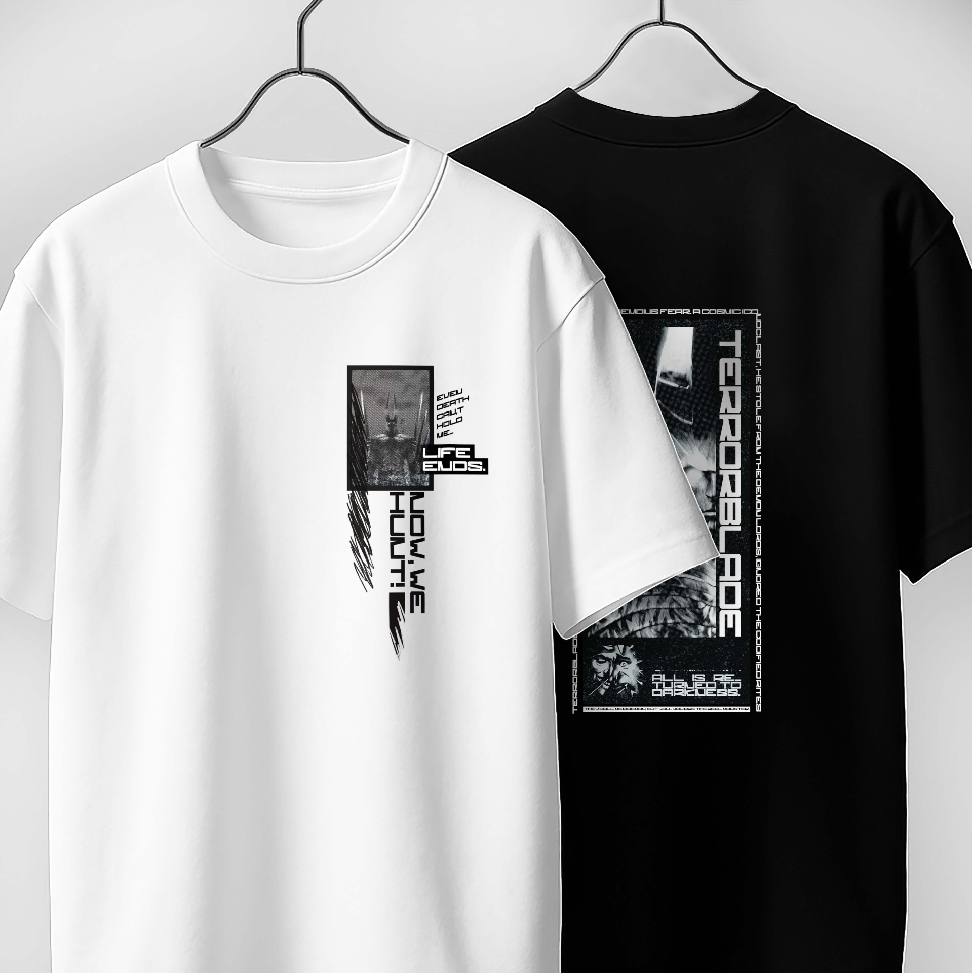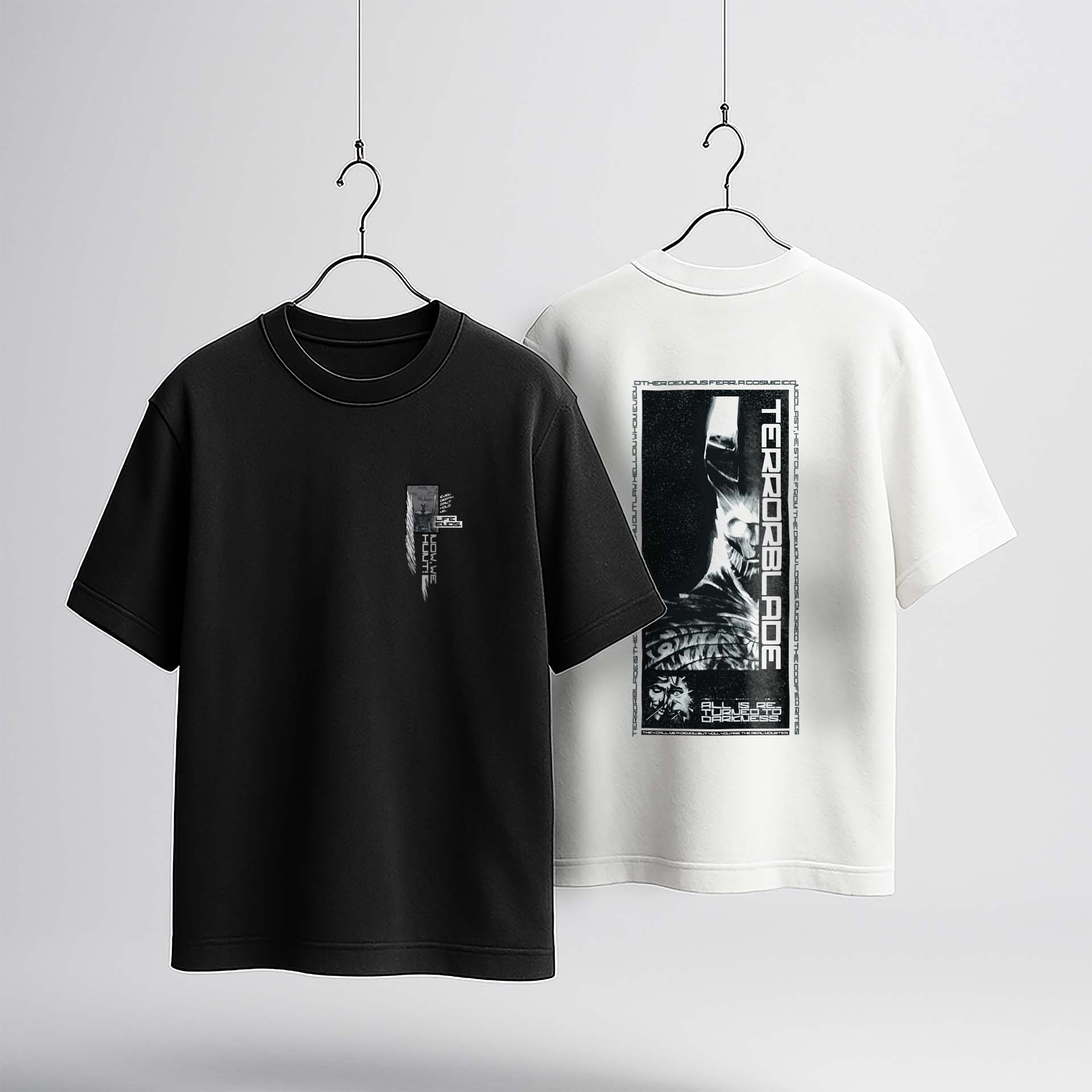 و اما پشت کار یک کادر عمودی که تصویری بزرگ تری از تروربلید رو با همون افکت ها و سایههای خاص، تایپو گرافی های دور کادر و فضای دارک می بینیم...