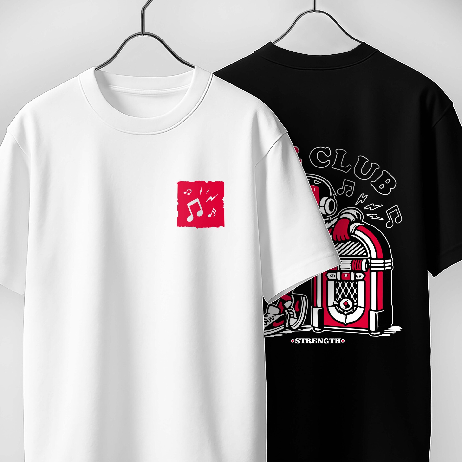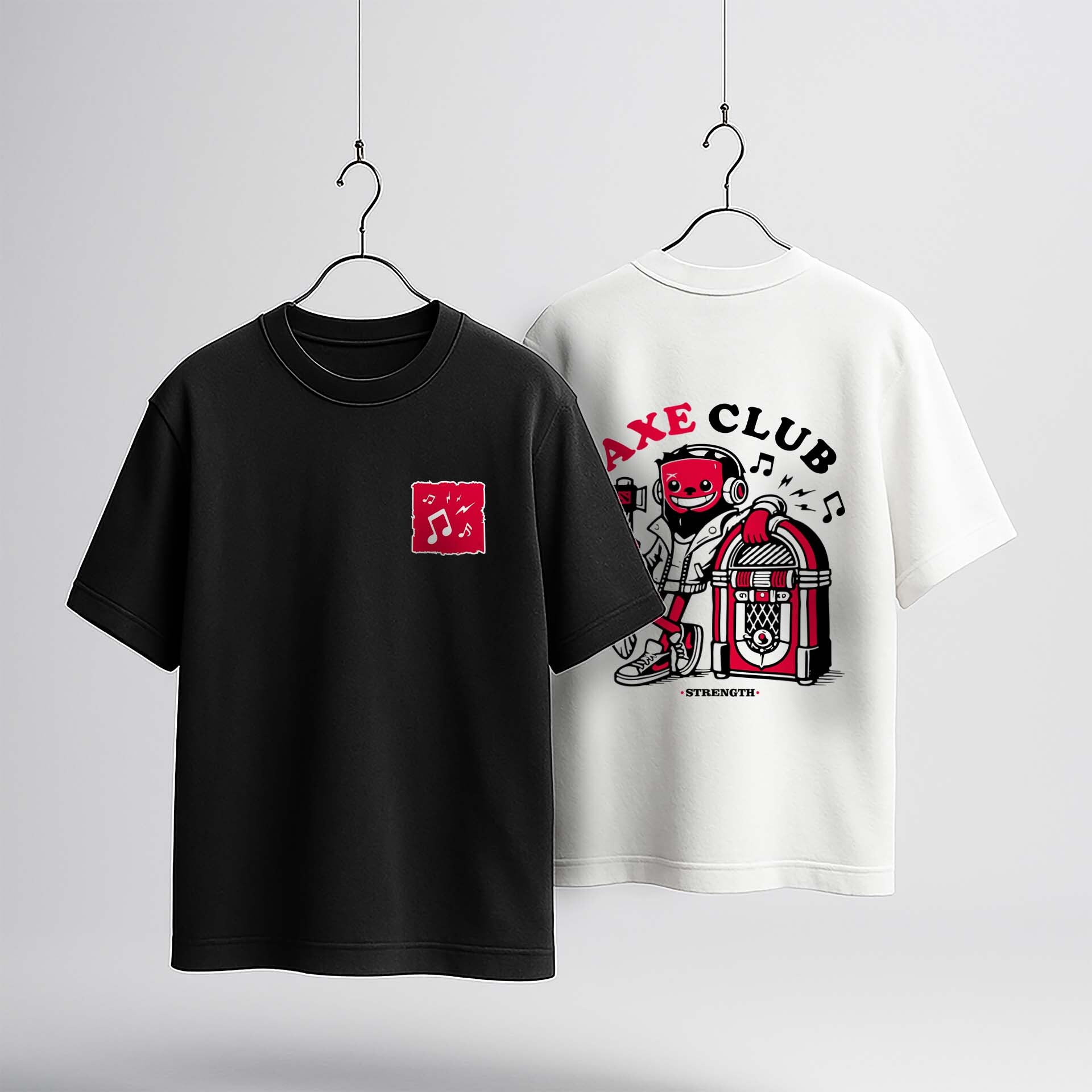 یه Axe کارتونی، با هدفون و لبخند بزرگ، تکیه داده به یه دستگاه جازباکس قدیمی مثل اینکه DJ شیفت شب شده!